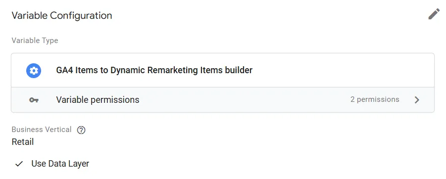 Use Data Layer: Checkbox that determines the data source, set totrueBusiness Vertical: String that identifies the business sectorGA4 Items: Array of objects containing item data. Follows the GA4 schema